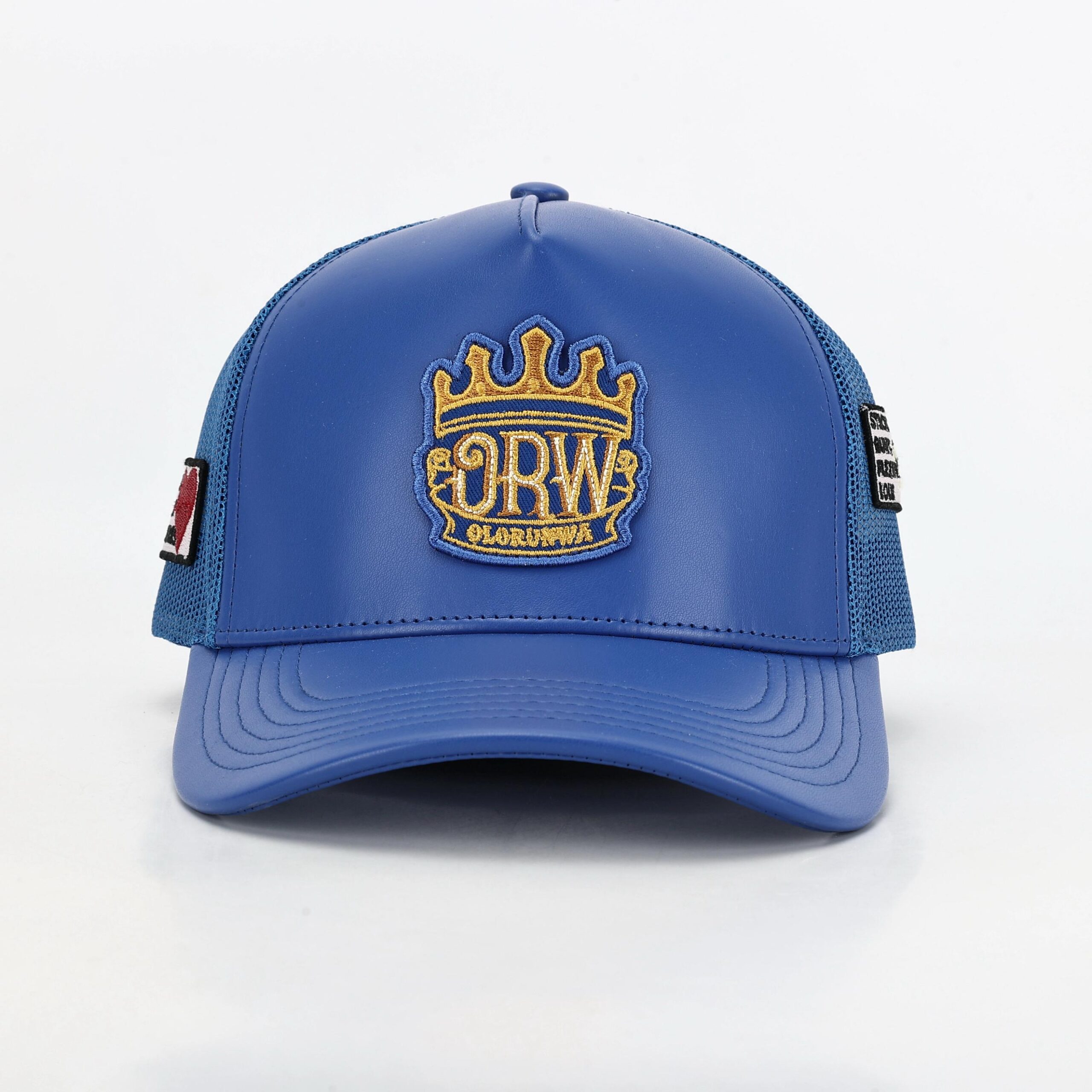 • Elevate your look with the Olorunwa Crown Leather Cap,  a perfect blend of luxury and bold streetwear. Crafted entirely from premium Blue leather, this cap delivers a sleek and sophisticated edge that stands out in any crowd. The front proudly features the signature Olorunwa (ORW) patch logo, embroidered in rich gold and white tones with a crown design symbolizing excellence and power. Its structured design ensures a secure fit and long-lasting shape, while the soft inner lining provides exceptional comfort for everyday wear.